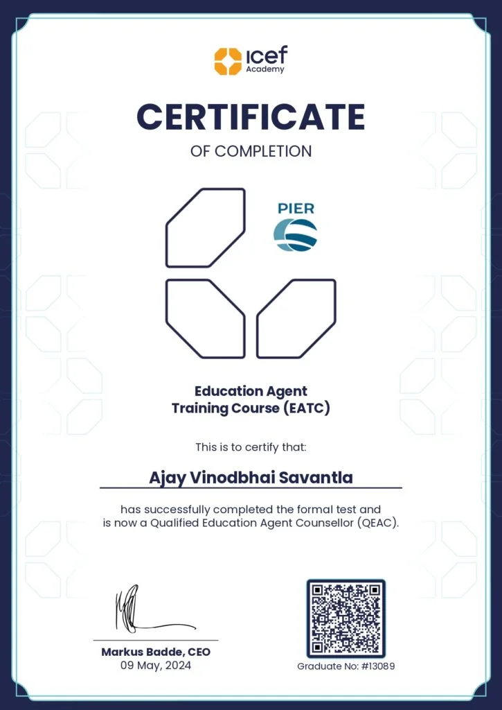 AJ Overseas is thrilled to announce that we have finished the Education Agent Training Course of Australia and am now a Qualified Education Agent Counsellor of Australia (QEAC).